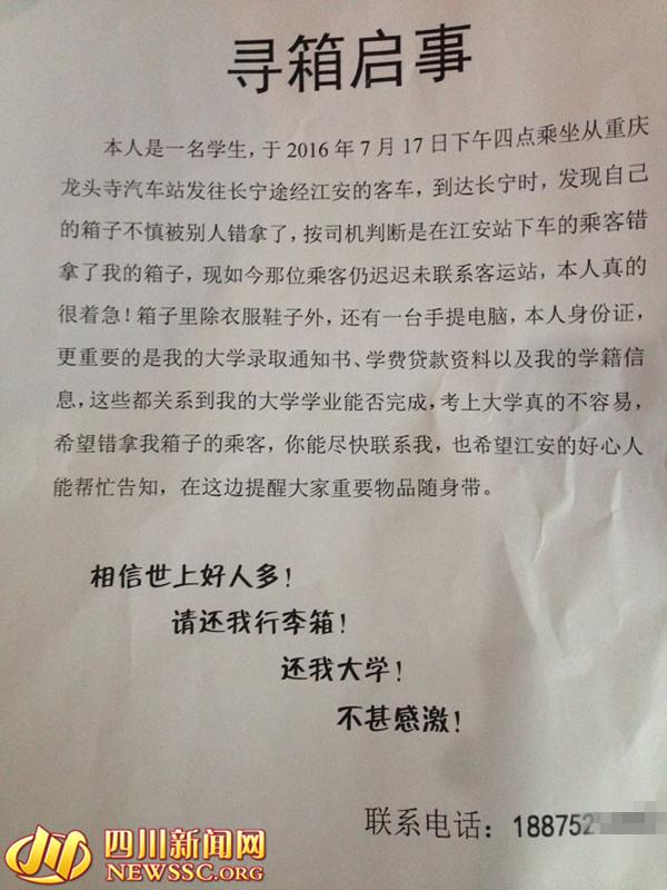 小雅是宜宾市长宁县人,今年20岁,本在重庆理工大学上学。本月17日,学校放假后小雅乘车返回长宁。途中,小雅携带的旅行箱放在大巴车的行李箱中。到站后,小雅发现自己的旅行箱被错拿了,只剩下一个跟自己相近的旅行箱留在原处。急坏的小雅开始在客车沿途进行寻找,并在江安县发布了寻箱启事,但一直都没有什么消息。