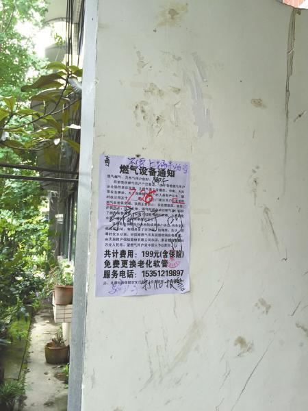 下午1点,记者来到十二桥路34号。陈先生所在的单元门口依旧张贴着通知:“为了保障燃气用户的人身财产安全,届时我公司定于7月26日上门建议用户安装使用燃气自运保安阀……共计费用:199元(含保险)……”