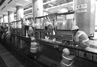 昨天,工人在安定门站安装屏蔽门。京华时报通讯员孙立杰摄
