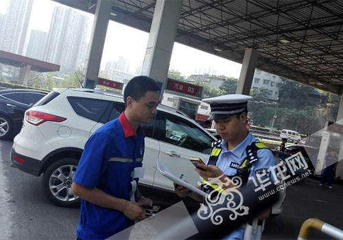车主加完油后忘记付钱,油站员工求助民警。沙坪坝警方供图