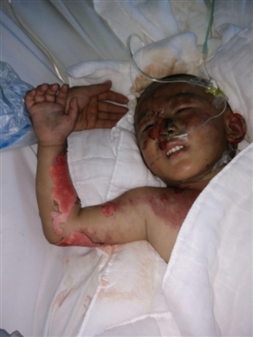 通过父亲郭勇拍摄的图片,记者看到,弟弟烧伤的部位皮肤大面积剥离、起泡、红肿,惨不忍睹。根据院方下发的《病危通知书》:郭嘉俊(弟弟)特重度烧伤、吸入性肺炎、休克。