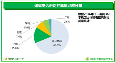 十一期间,360手机卫士共为全国用户识别拦截诈骗电话9800万次,平均每天识别拦截诈骗电话约1400万次。其中,一线城市(北上广深)诈骗电话的识别拦截总量为3000万次,约占全国总量的31%。由此而见,尽管电信诈骗有全国蔓延的趋势,但北上广深等一线城市仍然是不法分子进行“精准诈骗”的主要目标。