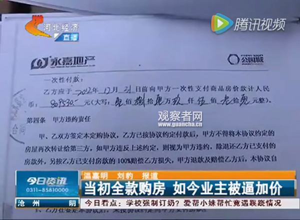 这件事就发生在石家庄。据河北电视台经济频道今日资讯栏目报道,石家庄的“永嘉·公园城”楼盘早在2012年就已开售,开发商向客户承诺于2015年12月31日前交房,到了2016年,开发商不仅未交房,还每平米涨价6000元。据河北电视台采访到的一名购房者出示的合同显示,当时购房价格为7208元/平米。