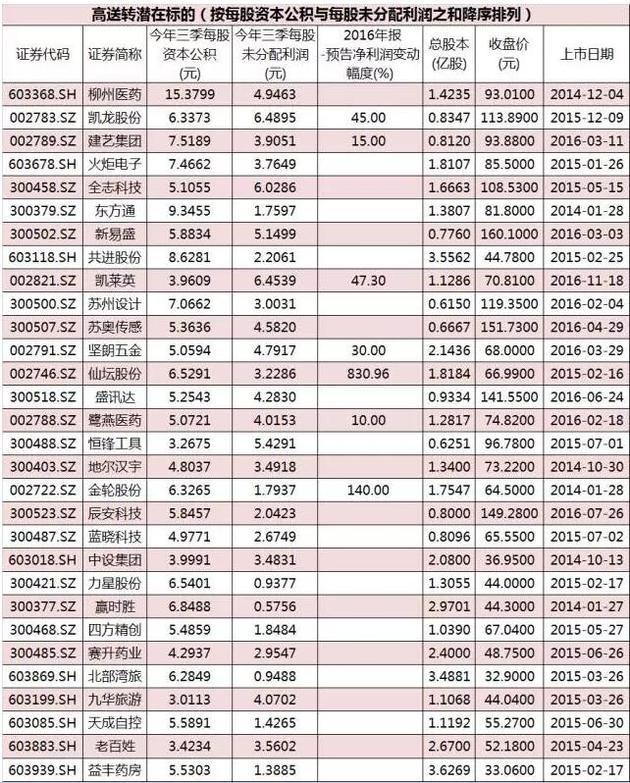 按图索骥,证券时报•e公司记者筛选了部分2016年高送转潜力股。筛选标准为:2016年三季报每股资本公积大于2元,每股资本公积月每股未分配利润之和大于5元,股价高于30元,总股本小于5亿股,2013年以来上市。同时剔除近3个月股价涨幅过大(超过100%)、年报已预披露送转、三季报业绩、最新业绩预告出现下滑等情形的公司。