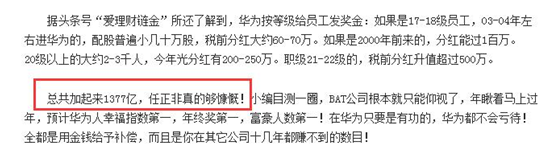 近期有自媒体图片爆料华为今年年终奖的发放标准,并计算出其年终奖总额将会有1377亿元(一说1500亿),入职3年的员工可以分到15万(一说18万)的年终奖。