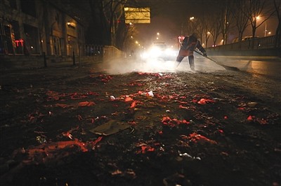 昨日凌晨1点,环卫工人开始清扫炮仗皮。