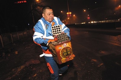 申军健是地道的北京人,40多岁。他带着两名同事从单位把环卫车开出来,到达南三环方庄桥的时候,已经是凌晨12点,这时除夕刚过,初一开始。