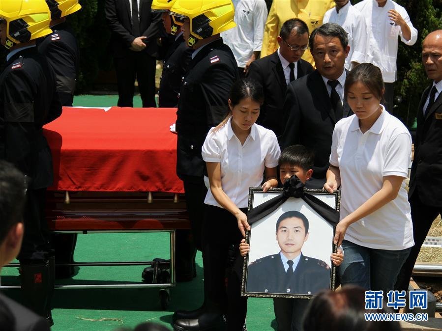 7月22日,许志杰的灵柩盖上特区区旗,由6名同袍扶灵。当日,香港消防处为在牛头角工业大厦火灾中殉职的消防队员许志杰举行最高荣誉丧礼。新华社发(伍永健摄)