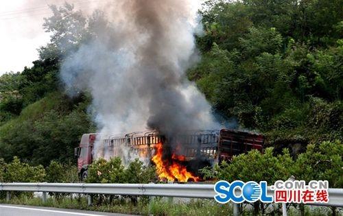 据了解,出事车辆是从山东某公司开往四川遂宁,驾驶员在经过广南高速嘉陵江特大桥时就发现车厢后面不断有烟冒出,过桥后停车检查才发现车厢后面起火了。