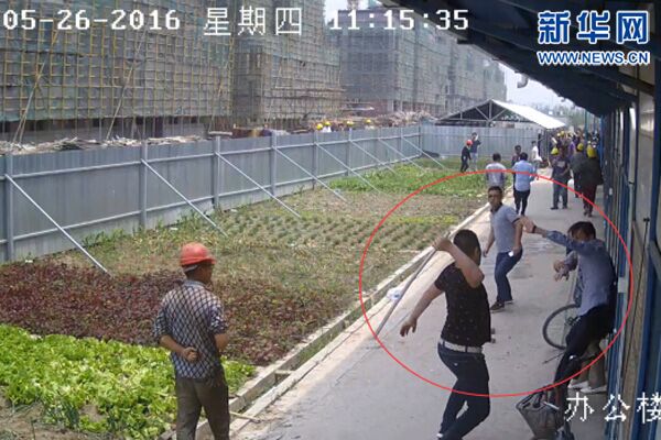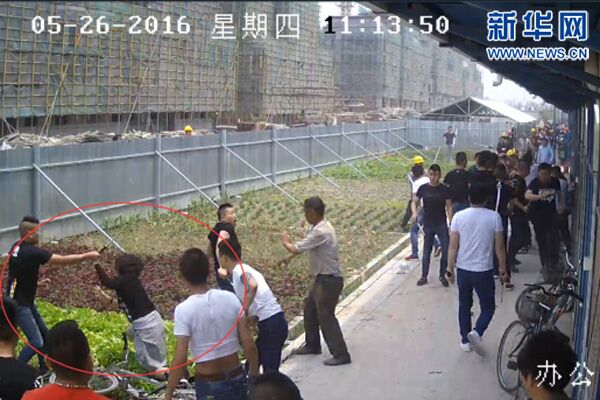 报料人提供两段视频是今年5月26日事发工地监控拍摄到的。第一段视频时长4分钟左右,视频显示,从11点12分开始,在一处建筑工地的活动板房前,有几名年轻男子在用砖块砸二楼窗户玻璃,随后便有人下来阻止,二、三十名年轻男子便掏出棍棒,开始打成一片,场面非常混乱。11点14分,一名被打得男子手捂住头,满脸是血。在该段视频中,一位身穿黑色外套的老年女子也出来阻止,被多人打倒在地,其中一男子甚至举起旁边的自行车砸向倒地的老年女子。工地的几名工人过来拉架,也被这群人用棍棒围殴,吓得退了回去。