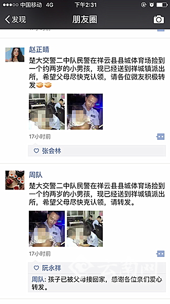 民警遇2岁走失男童 巧用朋友圈助其寻亲(图)
